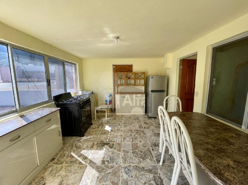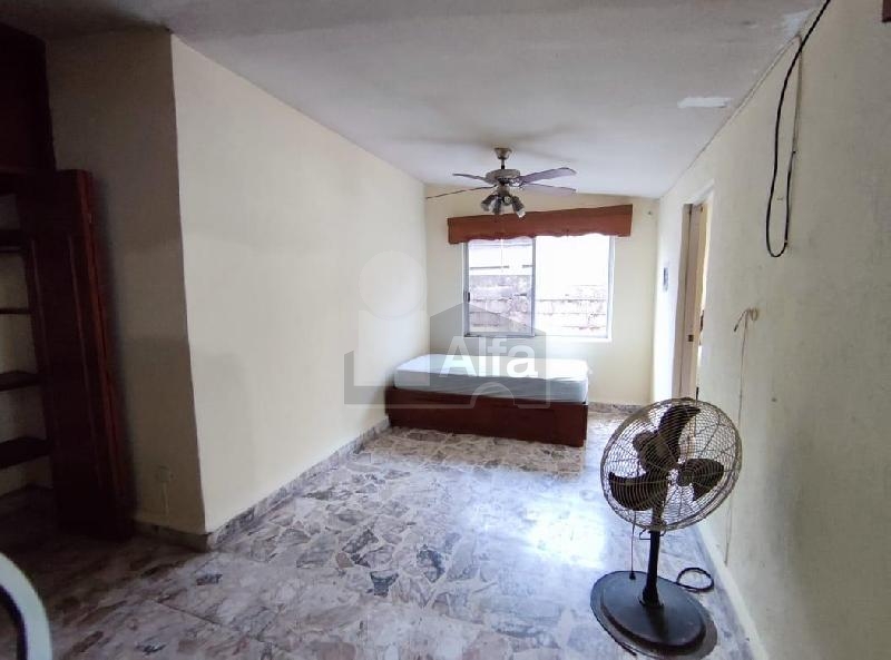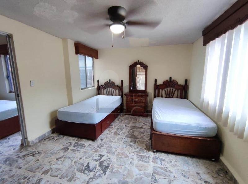 Comedor, cocina, estufa, refrigerador, dos recámaras, un baño completo, 1 clima, 3 camas individuales con cabeceras y burós.