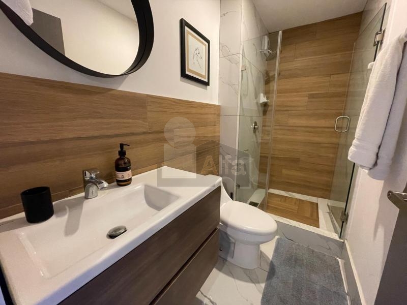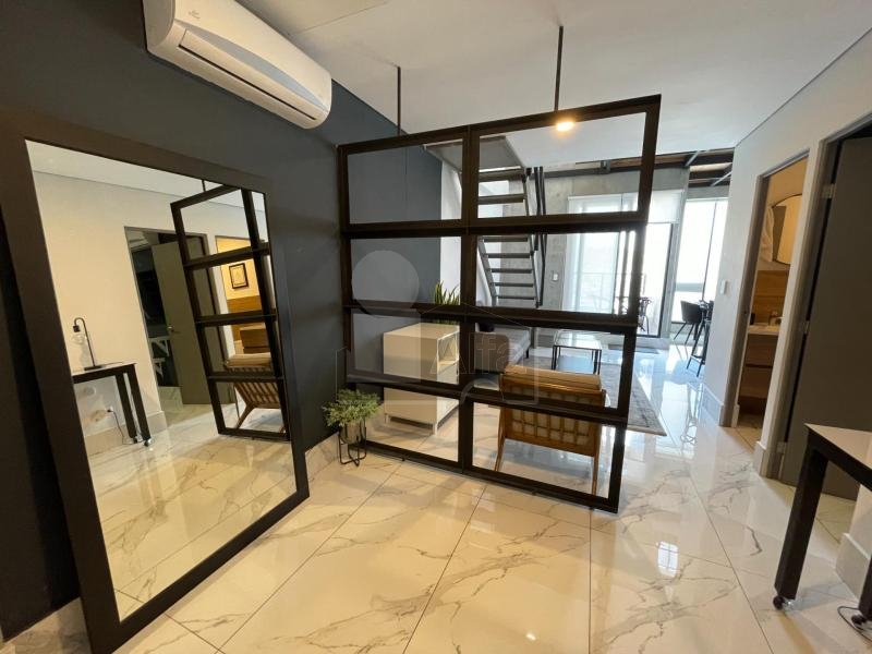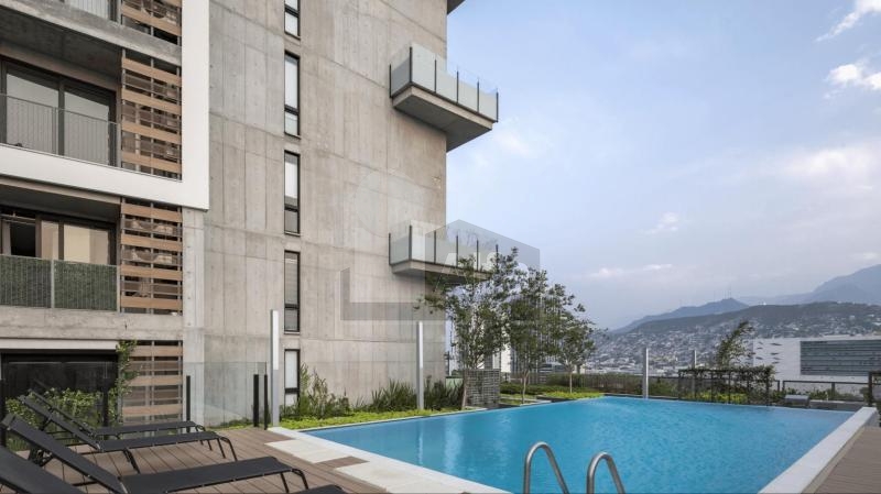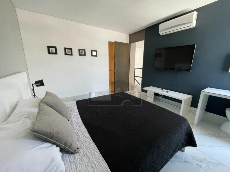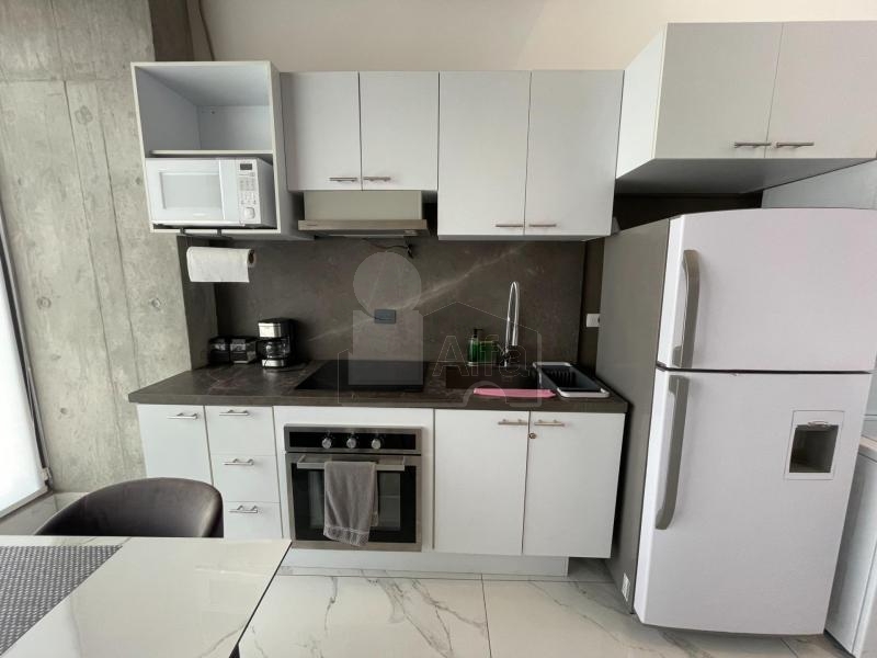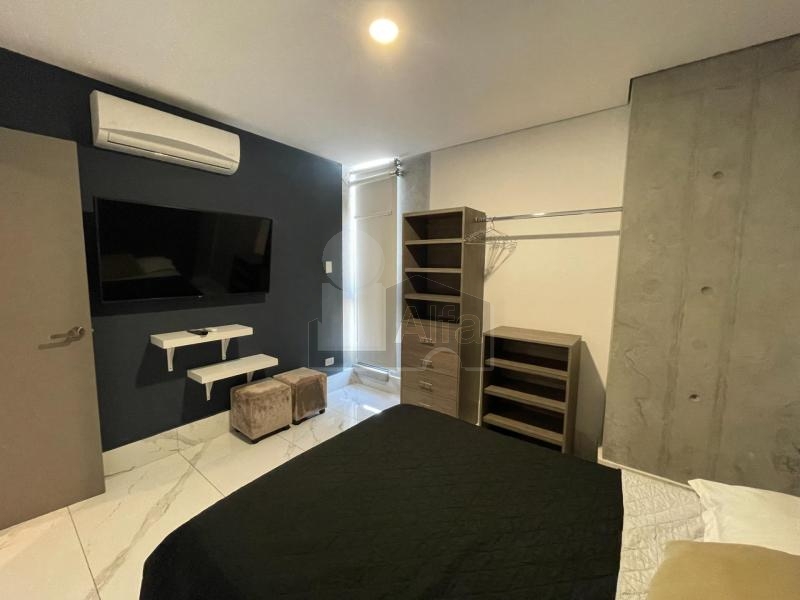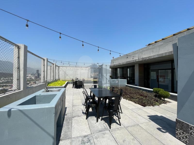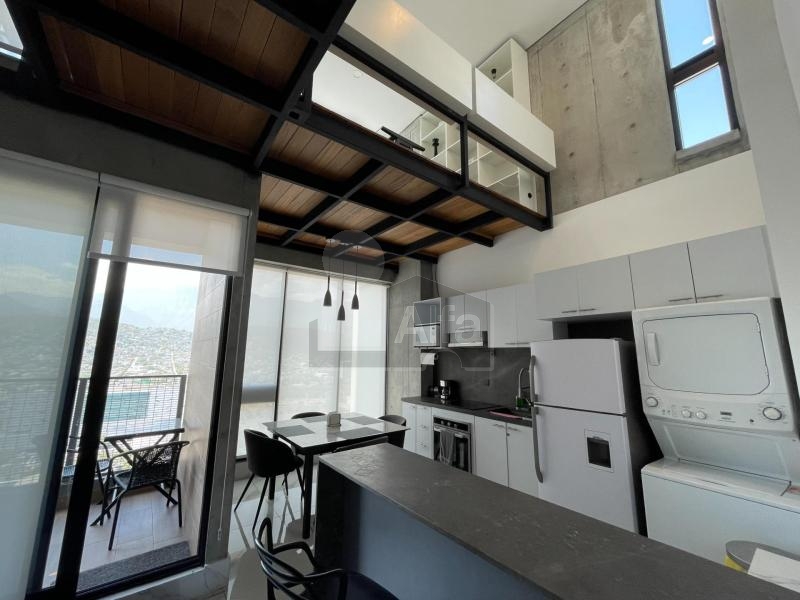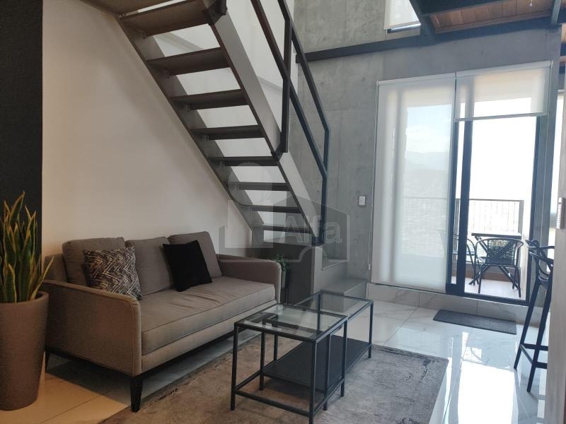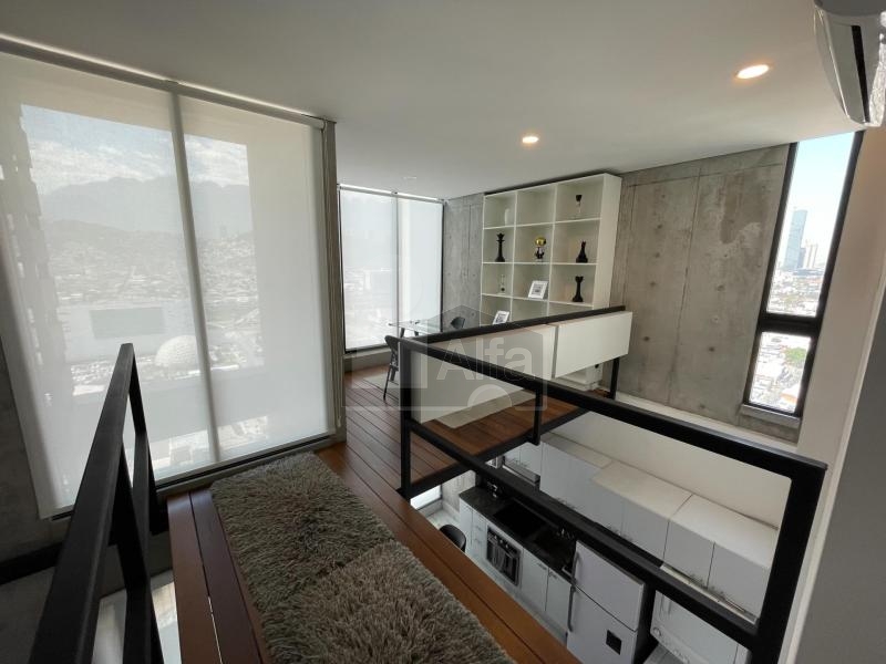 Departamento en venta o renta en Semillero La Purísima, Colonia Centro, Monterrey Nuevo León. Amueblado y equipado.104 mts2 de Construcción. Con balcón con vista panorámica. Dos plantas en piso 23. Planta baja: recibidor, sala, comedor, doble altura, cocina integral de madera con cubierta de granito, recámara secundaria, baño completo y balcón. Planta alta: mezanine que puede ser utilizado como estudio o cuarto tv, baño completo, recámara principal con vestidor.1 cajón de estacionamiento.