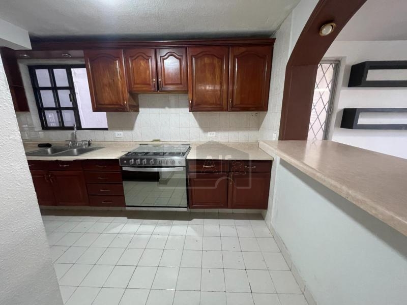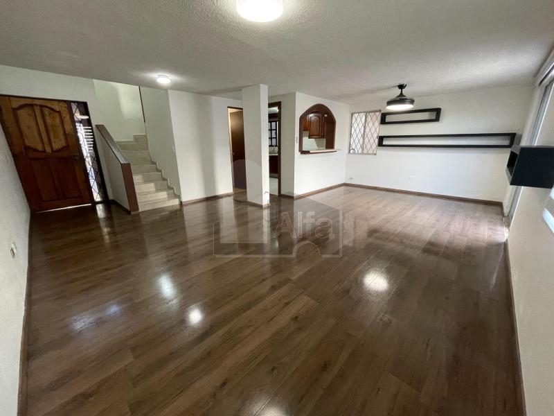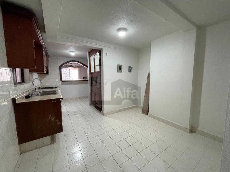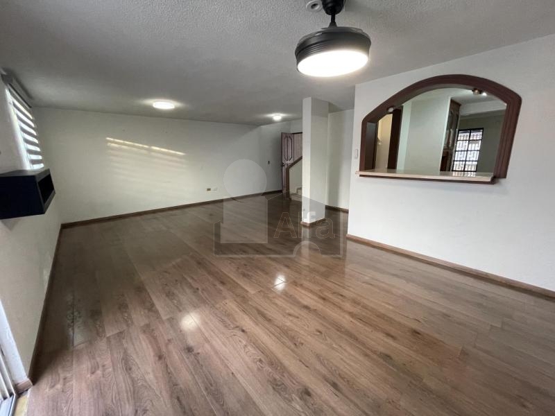Planta baja: cochera cerrada para dos autos, recibidor, sala comedor con duela, cocina amplia con cocina integral de madera con espacio para antecomedor, baño completo, cuarto de lavandería y patio con piso nuevo y pared verde.