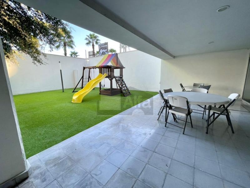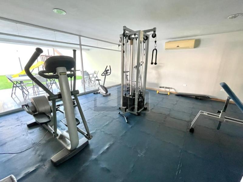 Área común: Gimnasio en planta baja, jardín con pasto y juegos para niños. La terraza cuenta con asador, salón polivalente climatizado para 50-60 personas y baños.