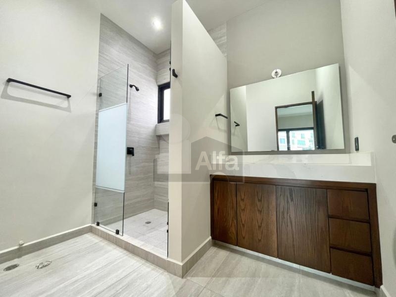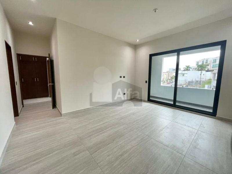 Planta alta: estancia familiar, closet de blancos y sinc, recámara principal con balcón, baño con doble lavabo, amplio vestidor. Dos recámaras secundaria con baño y vestidor, una de ellas con balcón.