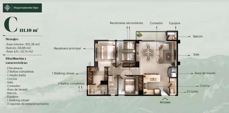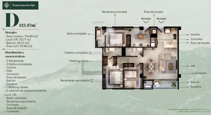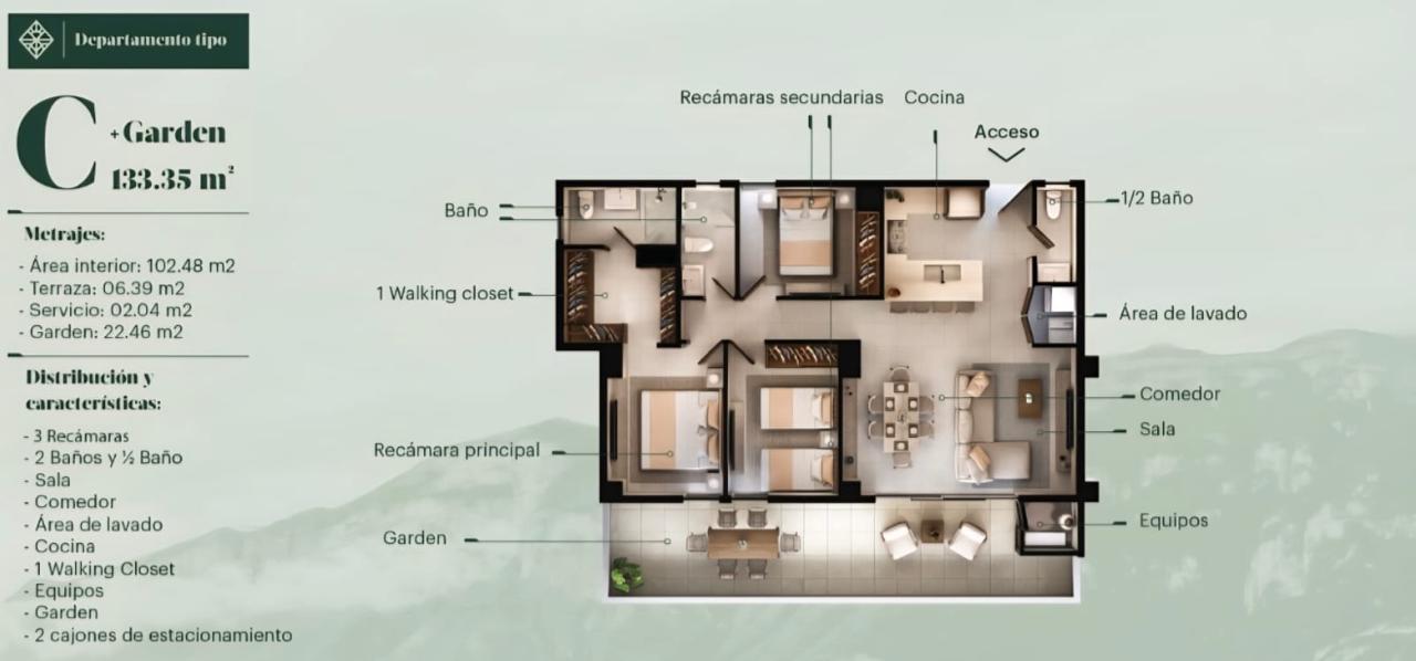 1.Tipo B (98.28m2) $5,800,000 2R, 2B + Flex, 2E. 2.Tipo C (111.10m2) $6,536,000 3R, 2.5B, 2E. 3.Tipo B Garden (118.26m2) $6,536,000 2R, 2B + Flex, 2E,Garden 19.38m2. 4.Tipo E Garden (145.90m2) $7.370,000 3R, 3B, 2E, Garden 10.86m2. 5.Tipo D Lock Off (123.57m2) $6.808,000 a) 2R, 2B, 2E, 1 cocina, 1 lavandería + b) 1R, 1B, 1 cocina, 1 lavandería. 6.Tipo C Garden (133.35m2) $6,731,000 3R, 2.5B, 2E, Garden 22.46m2.