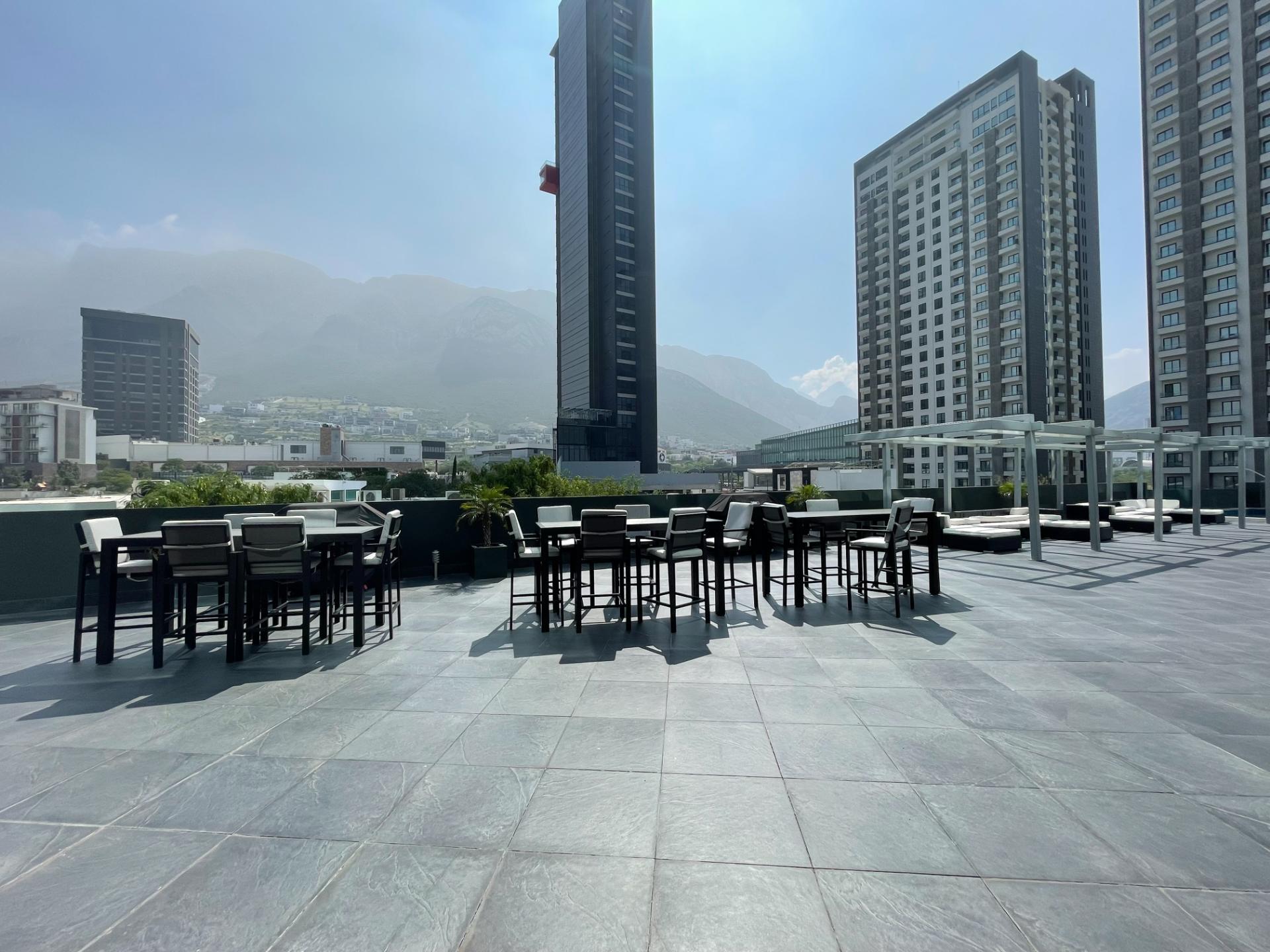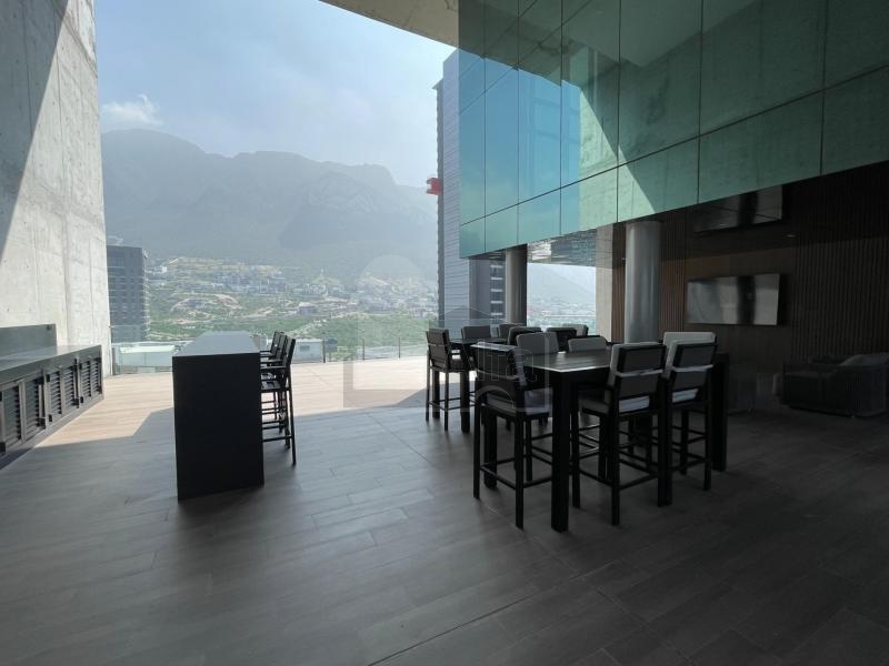 Ubicado en Valle Poniente con hermosas vistas panorámicas hacia la Huasteca y la ciudad. Entrega inmediata, totalmente equipados. Sala comedor con ventanales y vistas hacia La Huasteca. Cocina integral con isla de granito, campana, horno y parrilla eléctrica. Cancelería de vidrio, closet, cristales Duovent, Iluminación led. La recámara principal cuenta con vistas panorámicas. La torre cuenta con lavandería en el sótano 1. El complejo cuenta con caseta y vigilancia 24/7, recepción, increíbles amenidades, estacionamiento privado y techado, Pet friendly, jardines muy amplios. Hay 7 elevadores.