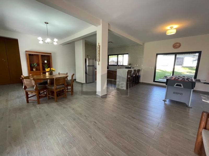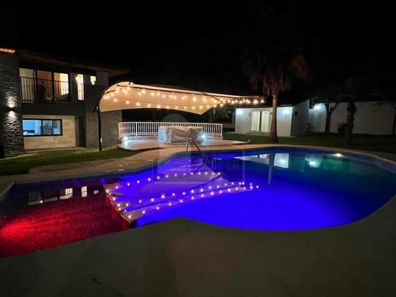 La propiedad cuenta con casa principal estilo contemporáneo, jacuzzi y alberca de 10m con chapoteadero, cuarto de máquinas y herramientas, palapa con asador, otra palapa con pantalla de TV, cuarto de baños con regaderas, cancha de basketbol o polivalente, juegos infantiles, casa del cuidador, fuente, árboles y algunos frutales (nogales, encinos, toronjas, etc), cuarto de herramientas, cámaras de seguridad, pozo de agua con sistema hidroneumático, fosa séptica, tanques de gas, servicios de luz, internet y sky.