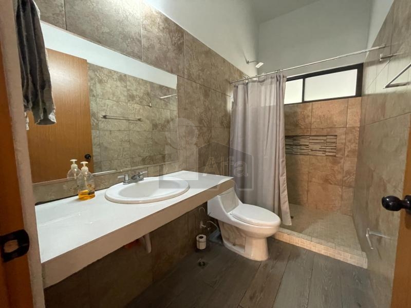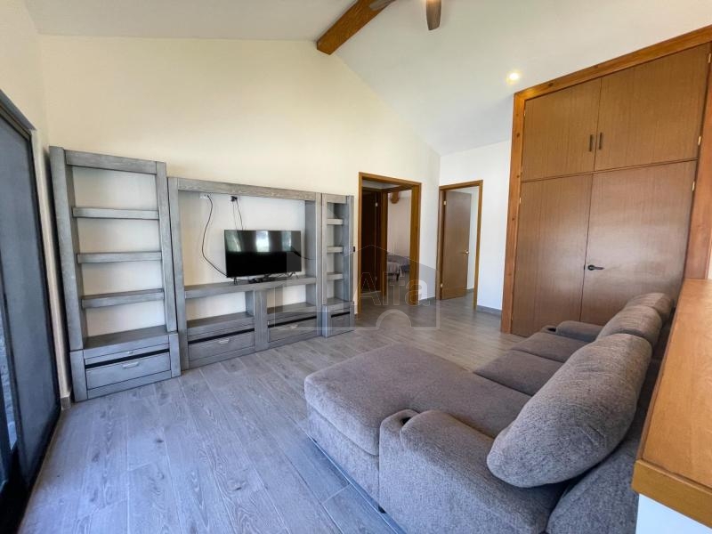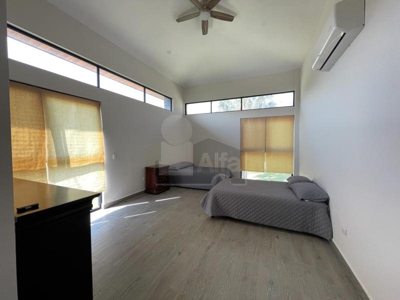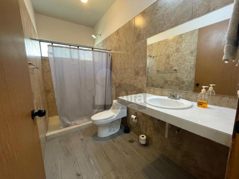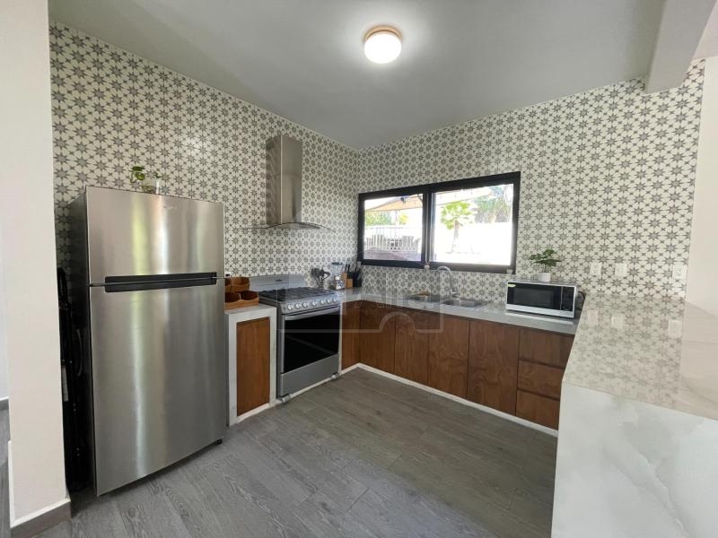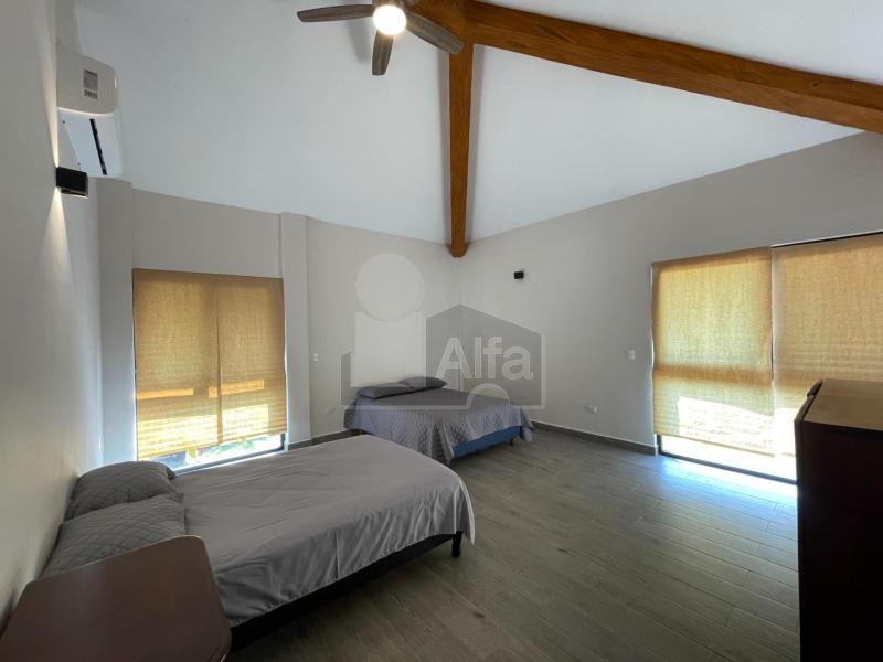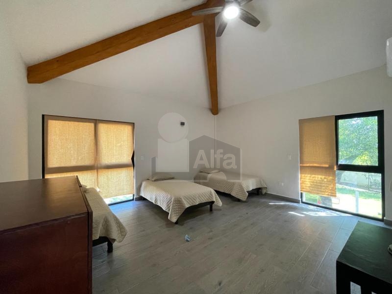 La casa de dos plantas y hermosas vistas a la quinta, cuenta con sala en exterior con chimenea. En planta baja tenemos área abierta de sala, comedor, cocina y baño completo. En planta alta cuenta con estancia familiar con balcón, closet con lavadora y secadora, y tres recámaras, la principal con baño y las secundarias comparten baño. Equipada con sillón de sala, comedor 6 sillas, cocineta integral con estufa, campana, refrigerador, micro ondas, juego de futbolito, candiles, 5 minisplits inverter, 4 abanicos de techo, los baños cuentan con mueble de lavabo y espejos, sofá cama y mueble de TV con pantalla, lavadora y secadora, boilers de paso, 4 camas matrimoniales y 3 camas individuales.