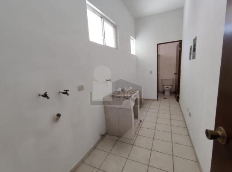 Planta baja: cochera techada para dos autos con reja, sala comedor juntos, cocina con cocineta integral y estufa, medio baño de visitas, lavandería con baño completo, patio, pasillo de servicio.