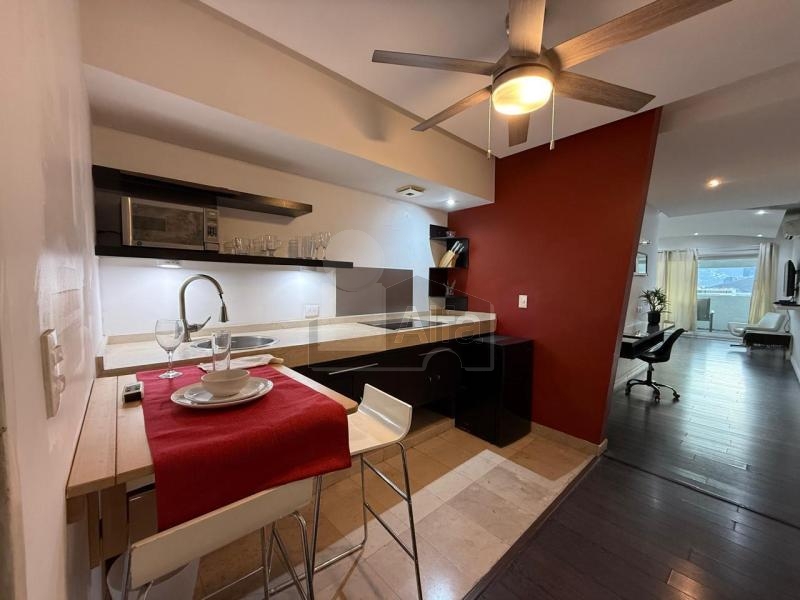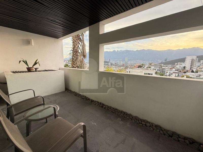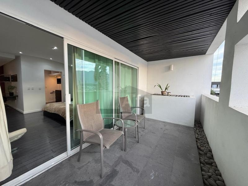Departamento Amueblado en Renta en San Jerónimo, Monterrey, N.L Edificio a pasos de Deportivo, muy cerca de Avenidas importantes, con excelentes accesos, restaurantes, plazas comerciales, gasolineras, supermercados y hospitales. $18,000 cuenta con Cocina, mesa y sillas para 2 personas, escritorio, cama king size, burós, sillón, lámparas de noche, cortinas. pantalla plana, vestidor, baño, terraza con sillas y mesa de exterior y minisplit. Totalmente equipado. Mantenimiento incluido.