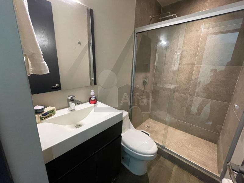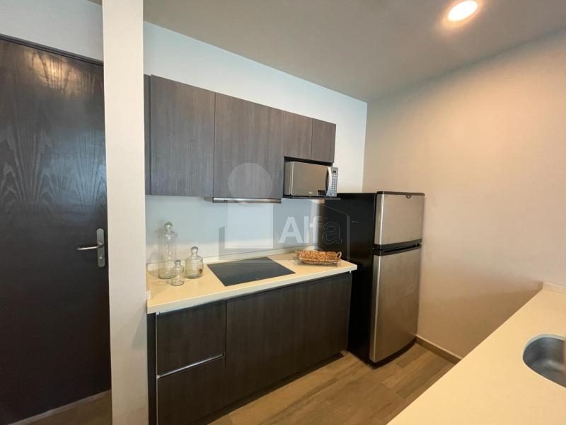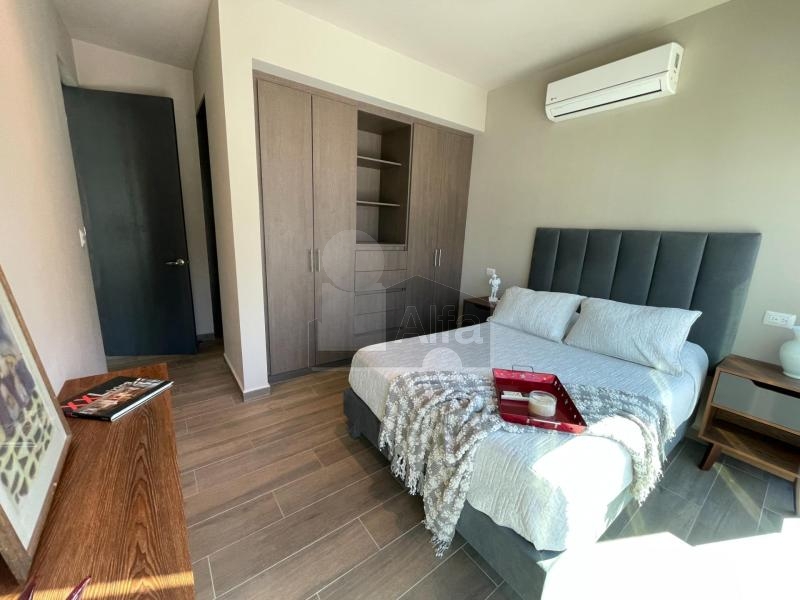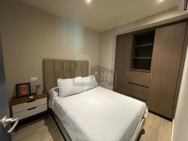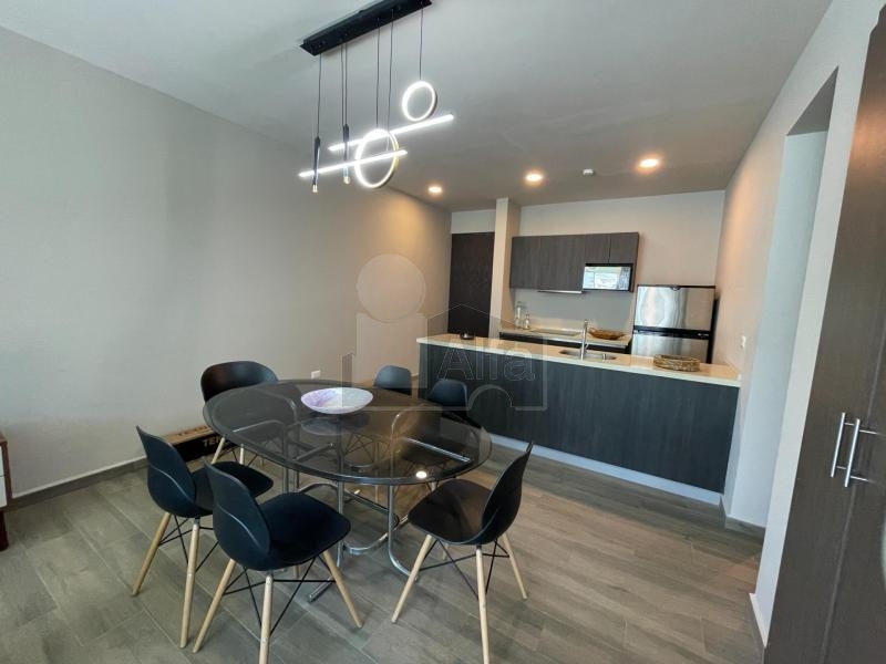 Totalmente amueblado, equipado y decorado, cuenta con sala comedor con cocina integral e isla de granito, 2 recámaras, la principal con ventanal closet y baño, la secundaria con closet y comparte baño con el área social.