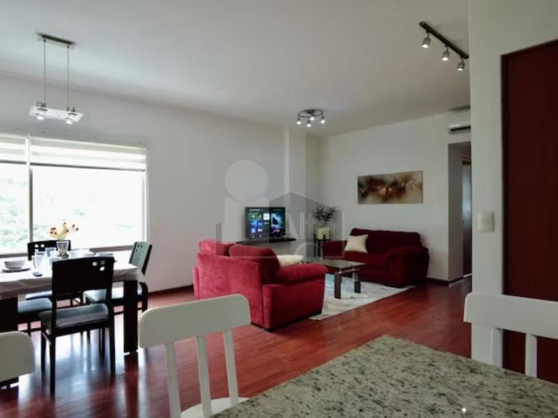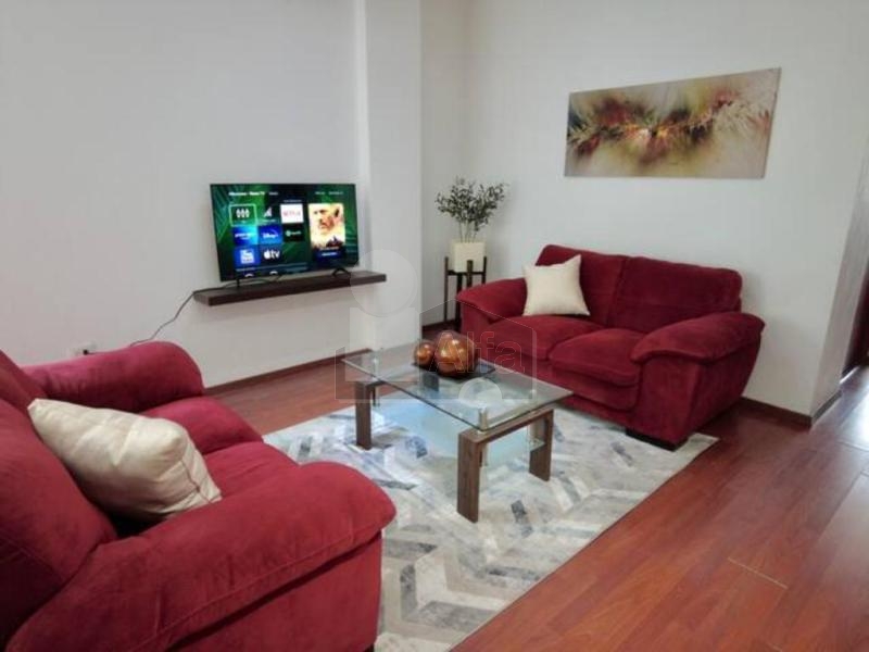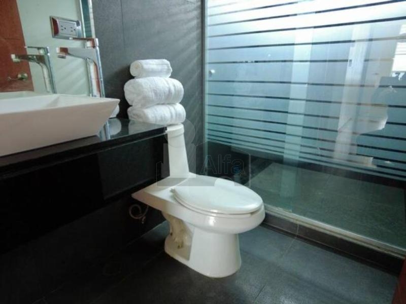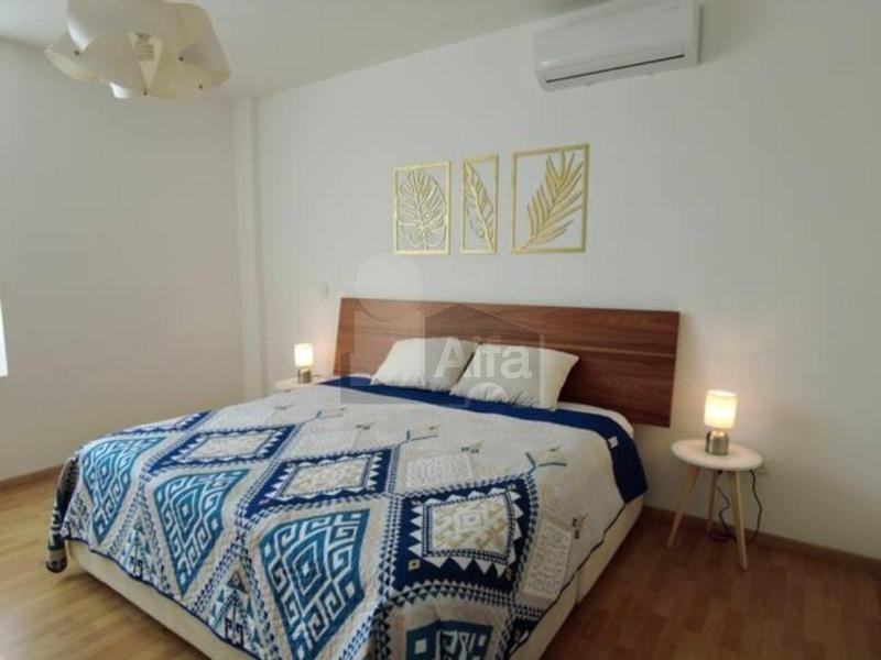 Equipado con duela en todo el departamento, cocina integral con barra de granito, estufa, campana, refrigerador, sala, comedor 4 sillas y bufetero, cama queen, cama matrimonial, cama individual, lavadora, secadora, 4 minisplits, persianas y boiler.